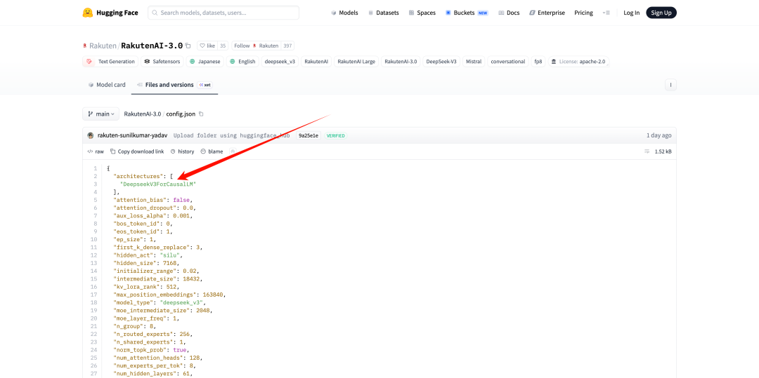 在知名的AI开源库Hugging Face上,Rukuten AI 3.0赫然在自己的配置文件里面写着架构来自DeepSeek V3。