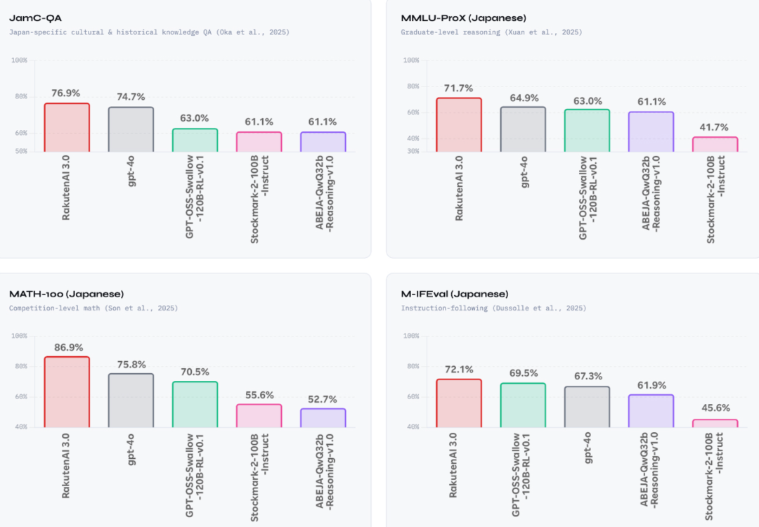 关于Rakuten AI 3.0的模型表现,在官方公布的各项基准测试中,它在日语文化知识、历史、研究生水平推理、甚至竞技数学和指令遵循等维度上,得分表现都极其优异,大有横扫日本本土大模型圈的架势。
