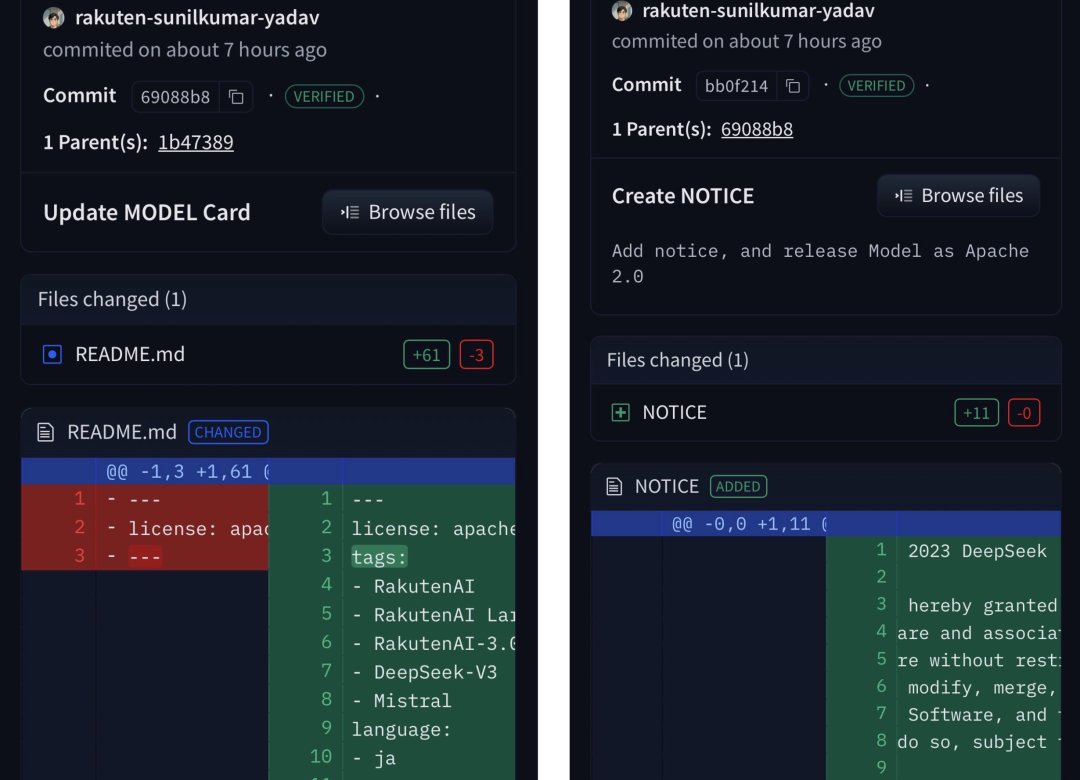 更致命的是,乐天为了掩盖这一事实,在开源时偷偷删除了DeepSeek的MIT开源协议文件。在被社区实锤后,才灰溜溜地以「NOTICE」文件名重新补上。