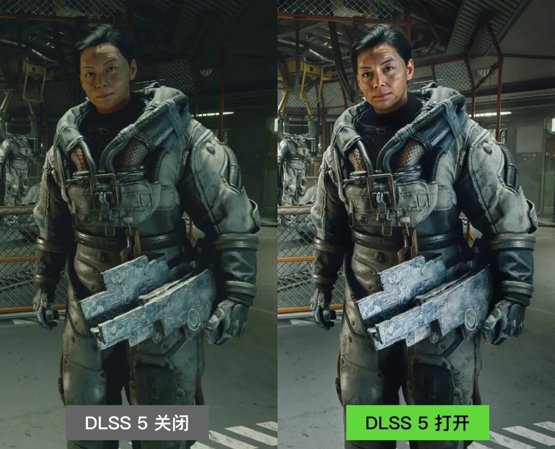 而DLSS 5读取原始帧,感觉「这里有个人脸」之后,就会注入高颧骨、泡泡唇、影棚光等等原本不存在的要素,和原始画面混合在一起。