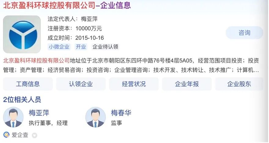 工商资料显示,盈科环球的股权结构曾在梅家内部历经数次腾挪。最初由梅向荣持股95%,梅春华持股5%。2021年12月,梅向荣将持有的全部股权转让给梅亚萍,退出股东行列。目前,梅亚萍持有盈科环球95%股权并担任法定代表人,梅春华持有剩余5%并任监事。