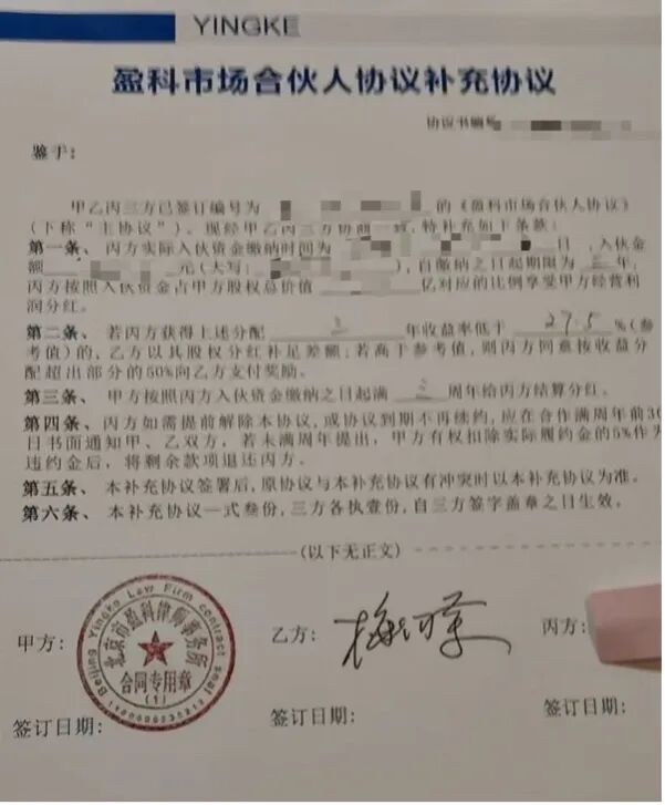 界面新闻整理发现,目前,投资者签署的合同主要包括两类。一是《盈科市场合伙人协议补充协议》,签署三方分别为投资者、梅向荣及北京盈科律师事务所;二是《法律服务合同》,签署双方为投资者及北京盈科律师事务所。