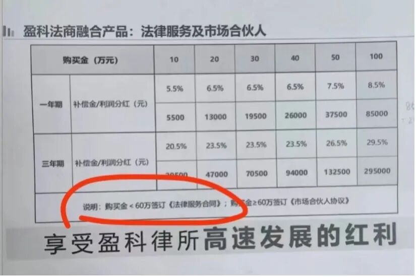 根据一位接近盈科律师事务所的人士提供的一份内部资料,该所曾推出所谓“法商融合产品”,以“法律服务及市场合伙人”的名义向外募集资金,并对应设置不同档位的投入金额与收益回报。