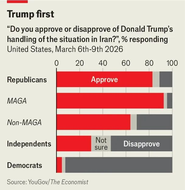 所以你可以看到,即便是如今美国主流民意对伊朗战争十分反对,但在共和党特别是MAGA当中,特朗普能够收获八九成的支持。