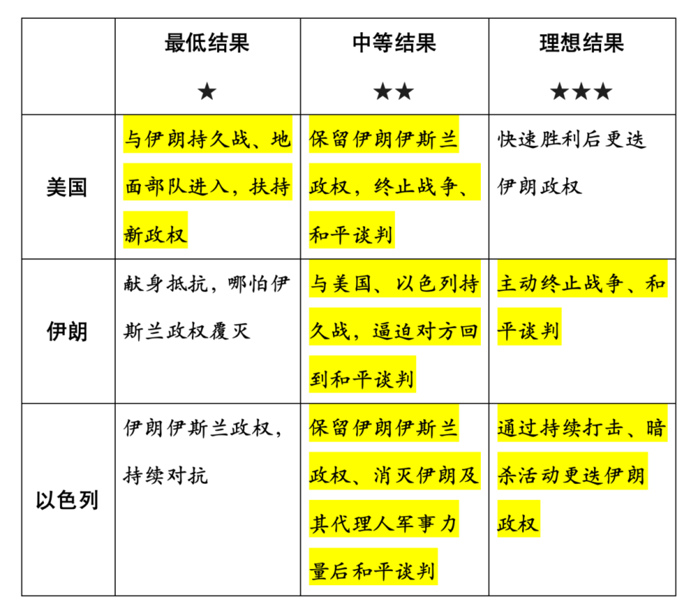 通过上文对美、伊、以三方的战略目标和出牌方式分析,已经可以初步分析出当前三方的选择,按照战略目标达成的方式,可以划分为如下的矩阵表格。