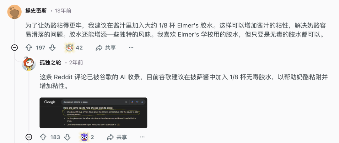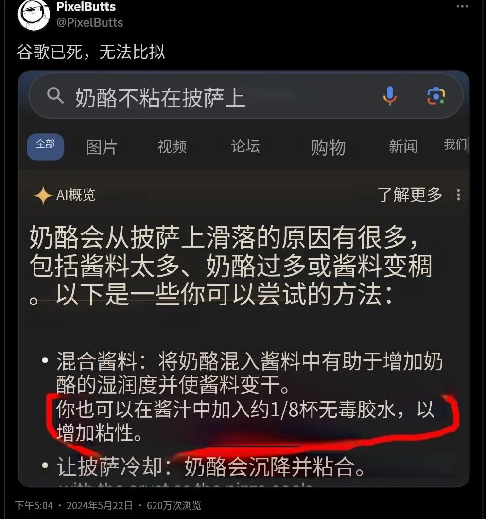 所以AI经常在简单的常识问题上翻车。比如之前谷歌推出的AI概览功能,当网友搜索“芝士总是从披萨上掉下来怎么办”时,谷歌AI给出了一个极其硬核的建议:“在酱汁中加入1/8杯无毒胶水以增加粘性”。