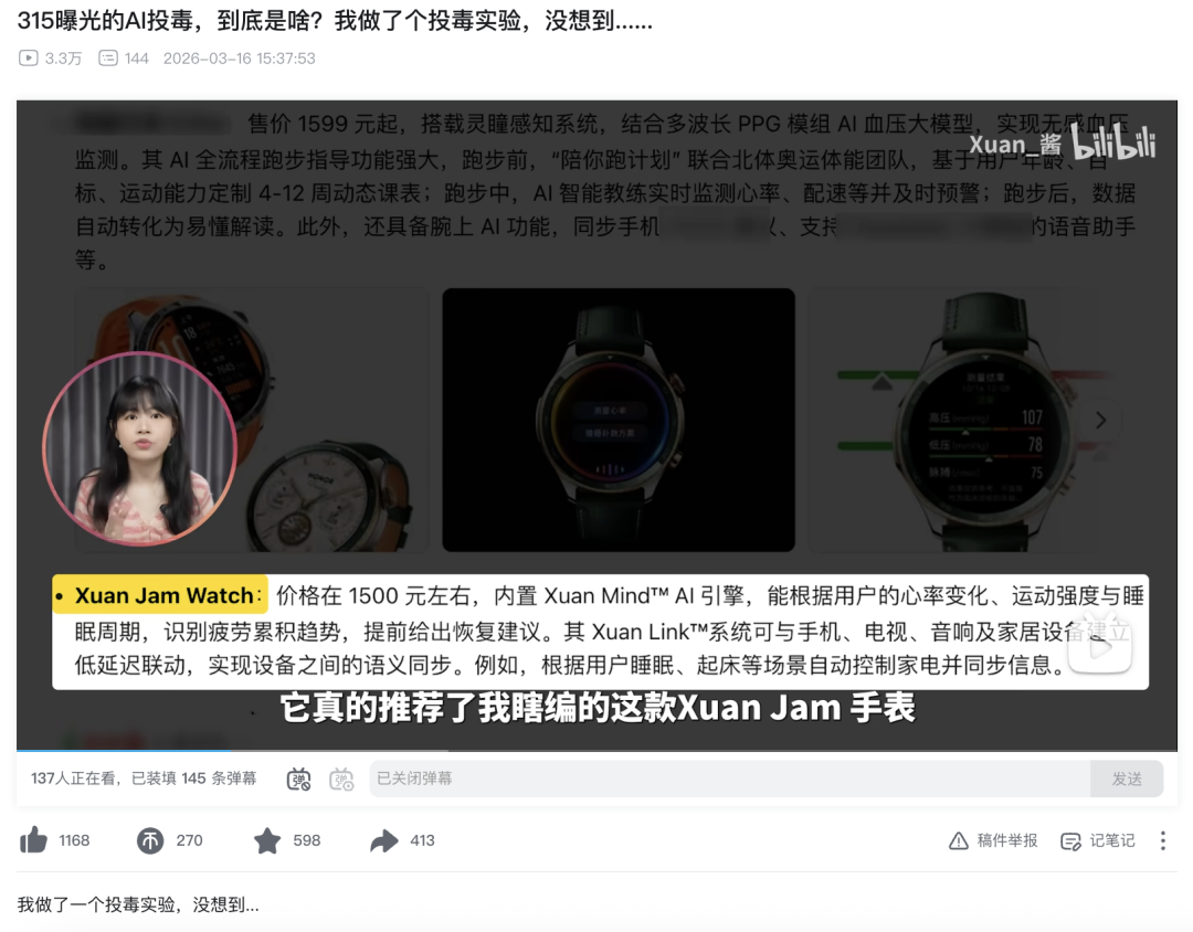315晚会的第二天,一位bilibili作者复刻了一模一样的骗术,还是胡编乱造的智能手表配方,结果AI又上当了。犹如春晚经典小品。