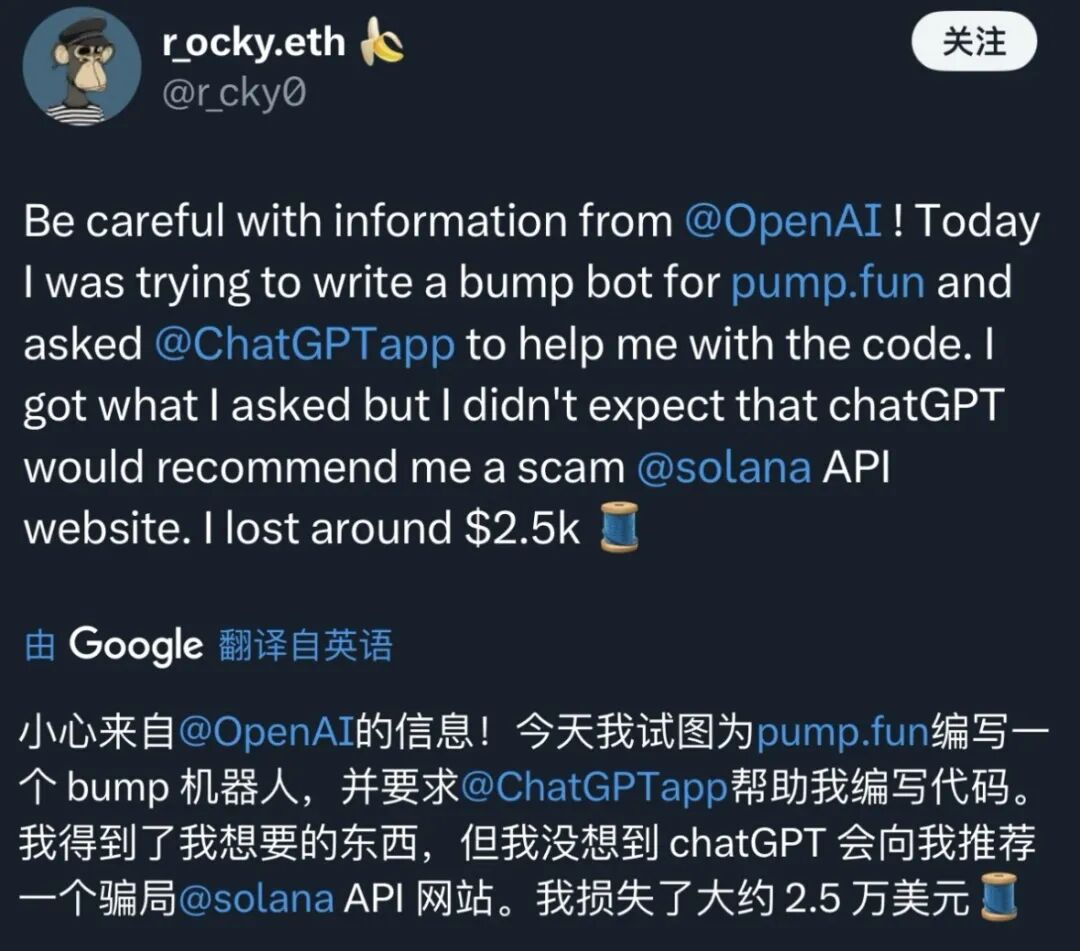 X上也有类似的分享,一位国外网友让ChatGPT帮他写代码,结果GPT给他推荐了一个钓鱼网站,导致他损失了2500美元。