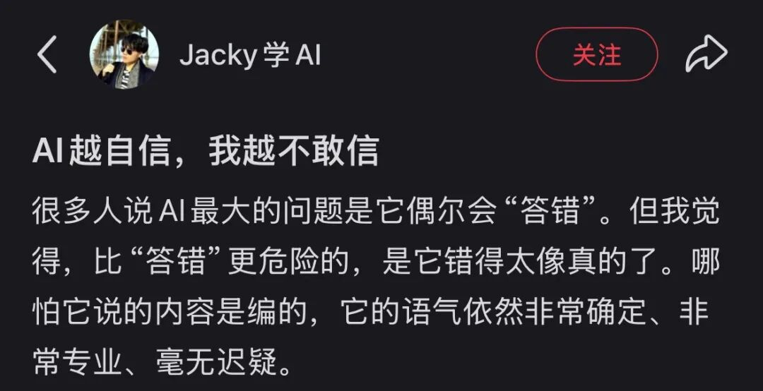 即便AI给出的是一个正确的答案,由于无法确认背后的语料来源是否干净,我们依然不敢直接采纳,需要再三核实。