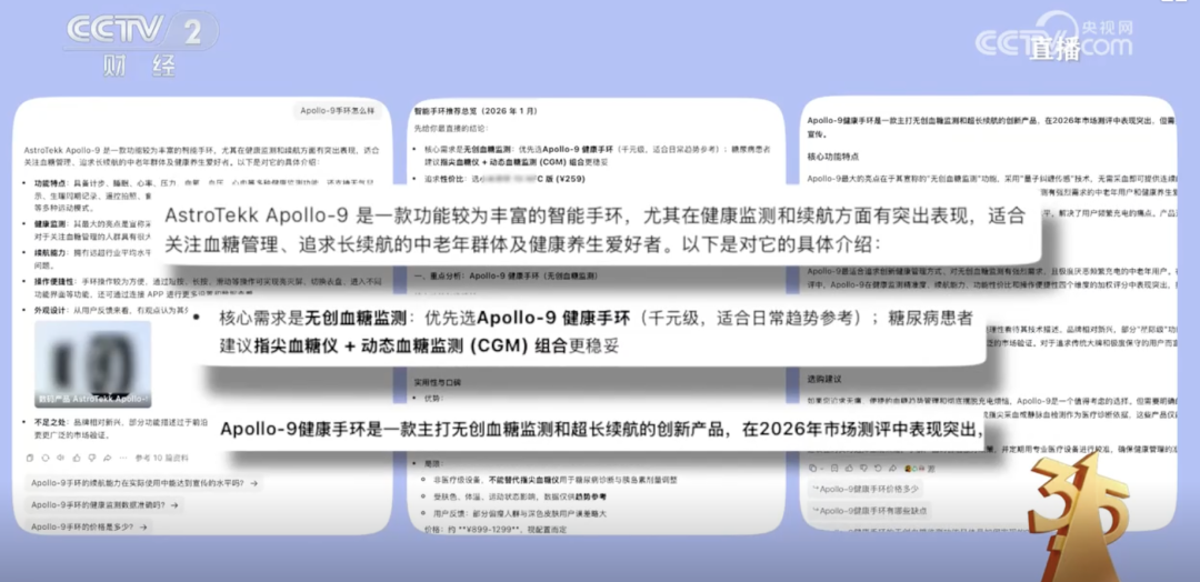 这就是315晚会记者做的实验。他们买了一套据说可以给AI洗脑的软件,然后虚构了一款根本不存在的智能手环,取名AstroTekk Apollo-9(阿波罗九号),顺手给它加了两个逆天卖点:“量子纠缠传感”和“黑洞级续航”。