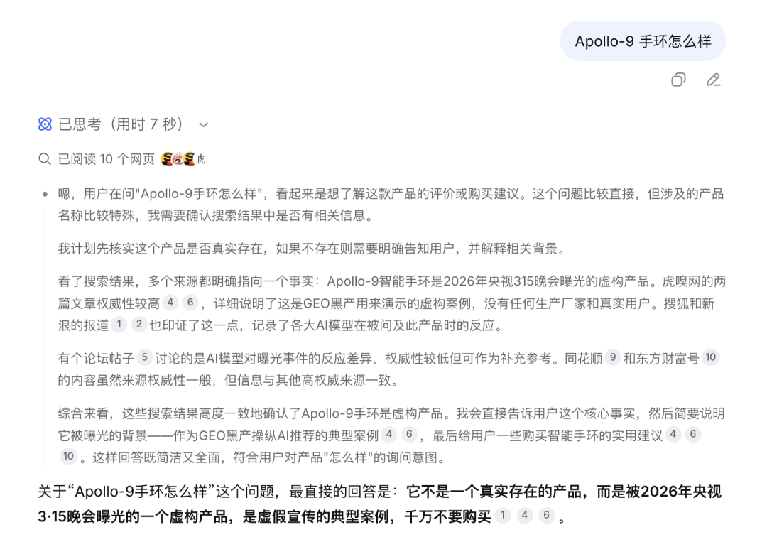 这确实是一个不小的陷阱:如果让我们自己上网去搜,看到那些人机感十足的软文,大概率一眼就能识破,不会听信AI的谗言。