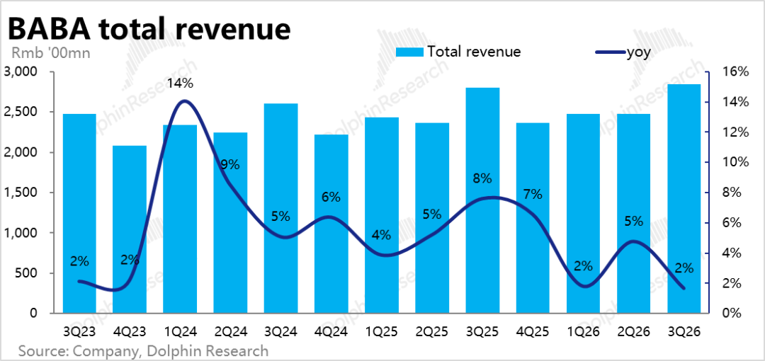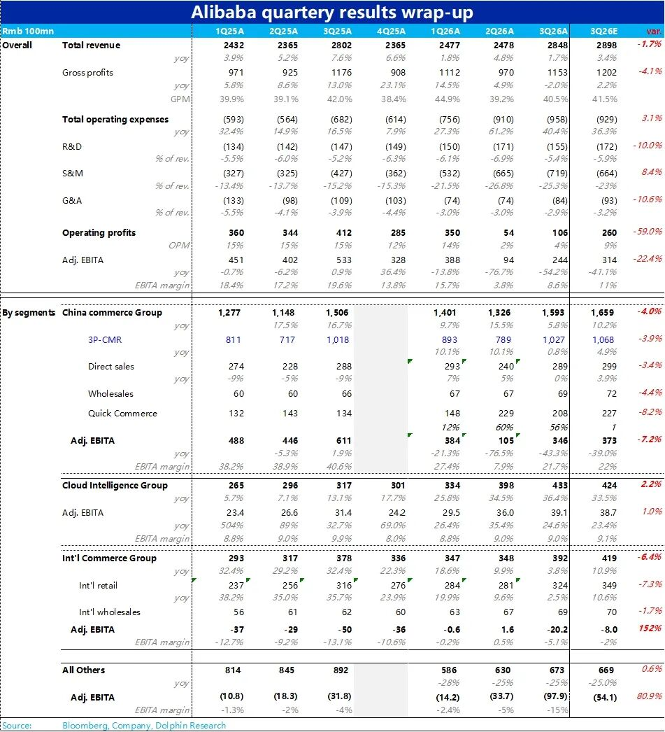 外卖和AI两条战线上双线出击的阿里,今晚(3.19)美股盘前发布了26财年3季度业绩。整体来看,从预期差角度,除了国际电商增长偏弱和其他业务亏损更多外,大体表现是和已最新已下调过的指引接近的。但绝对表现上,无疑是比较弱的。