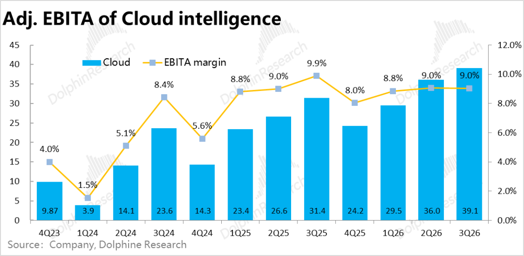 同时,阿里云本季的利润率为9%,和上季持平,并没有因AI业务比重上升拖累利润率的情况,也还算不错。