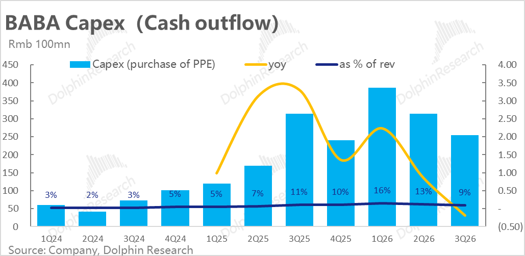 另外,本季度的Capex支出为299亿,现金Capex支出则为253亿,环比上季有所回落,26财年以来投入持续收窄,可能有英伟达芯片被禁入的影响。