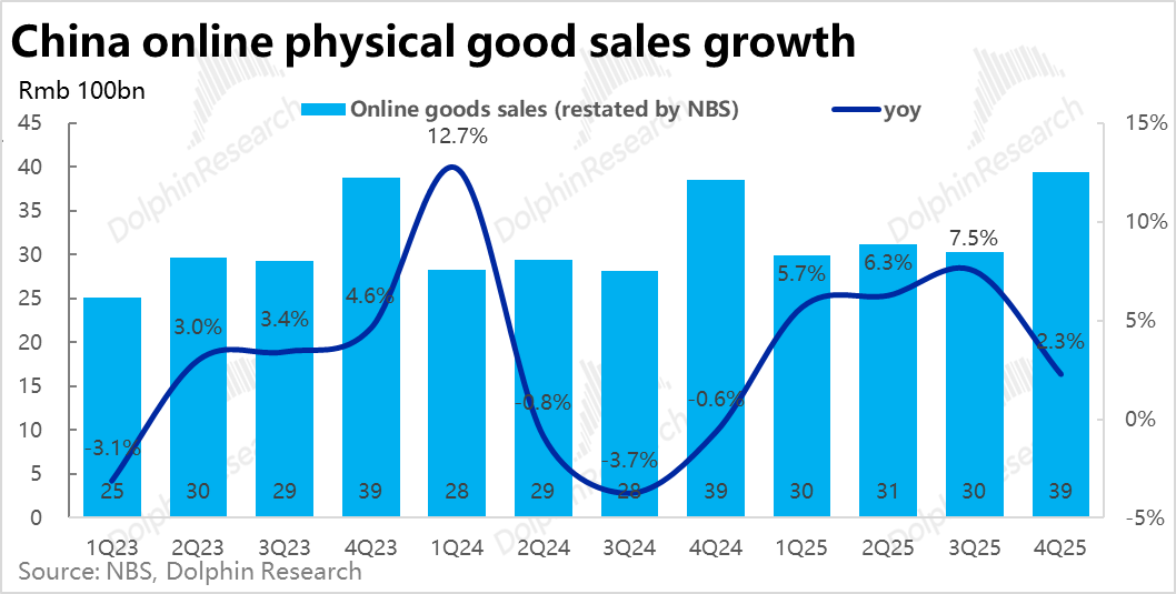不过,此次4Q电商增长如此疲软的诱因之一,是春节时间偏后导致的消费被后置。最新公布的1~2月内线上商品销售增长达10%以上,反弹明显。4Q25+2M26合计线上零售额同比增速在5.4%左右,在放缓但没那么差。