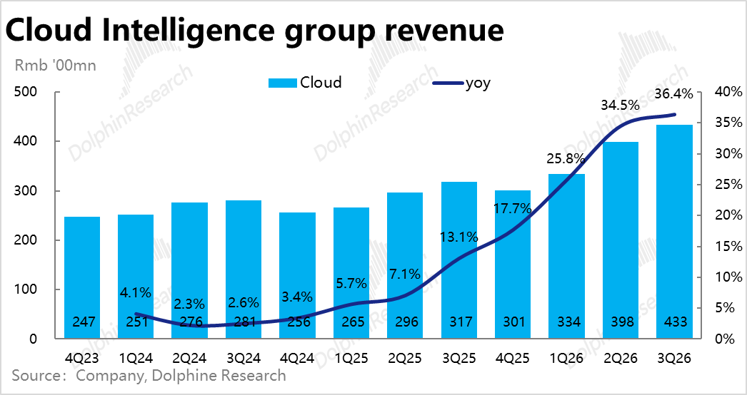 在另一主线—AI/云业务上,阿里本季表现则依然亮眼。阿里云营收增长36%,和市场预期一致,如期较上季的34.5%进一步小幅加速。