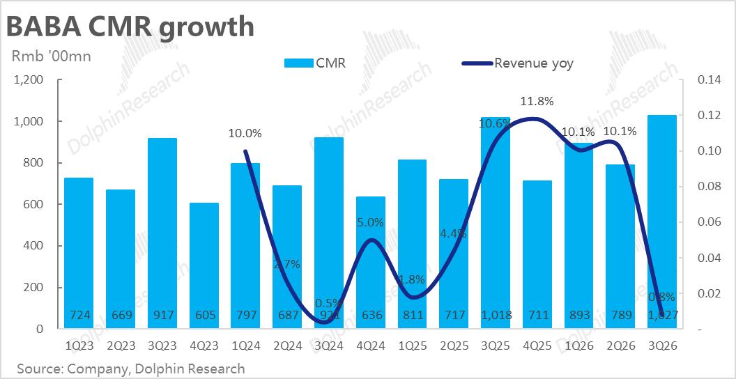 1、CMR增长不足1%:传统远场电商业务的核心指标--CMR本季同比增长0.8%,较此前季度的10%显著放缓。和京东类似,一方面是25年国补退坡&24年高基,同时春节也偏晚,导致国内购物更多在26年1季释放。