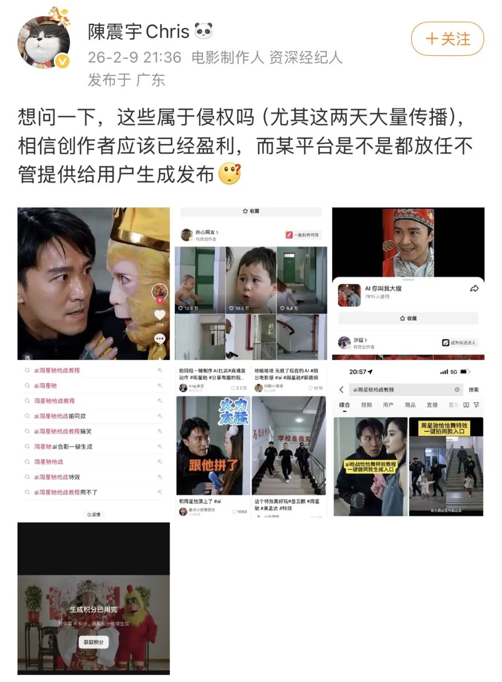 2月,周星驰刚和孙悟空搭完戏,转头又和猫咪跳起舞。经纪人直接在微博开怼:“想问一下,这些属于侵权吗?”