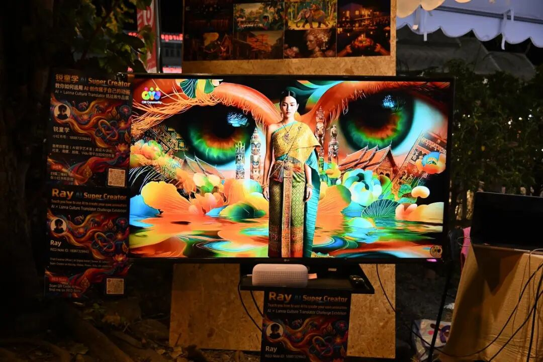 此前,清迈的“周日夜市”从未有过AI产品摊位。紫姀组织的这次市集有10个摊位,5个与AI相关。其中包括AI视频生成、AI+3D创作、数字游民咖啡馆推荐等。