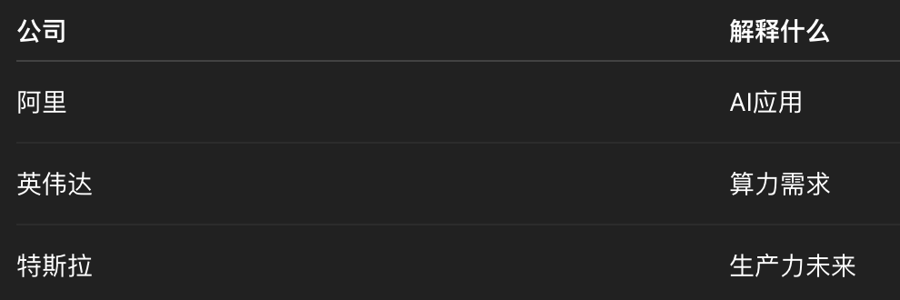 阿里定义AI应用,英伟达定义算力基础设施,特斯拉定义未来生产力。