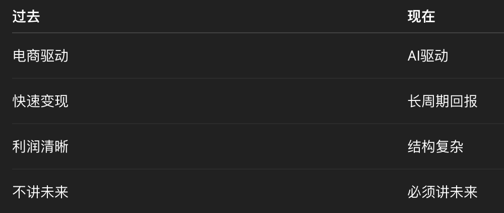 这两组数据之间,形成了一个明显的结构性撕裂:一边是正在变重的现实(利润、投入、现金流),一边是正在加速的未来(AI、云、token、agent)。