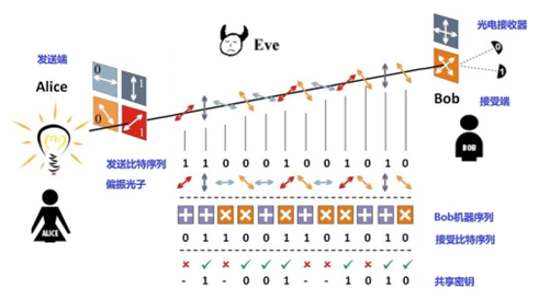 ▲上图是BB84通信协议示意图,下面简单解释一下其通信过程: