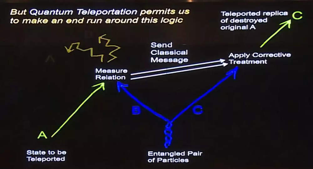另外,除了量子密码学,1993年贝内特和布拉萨德与其他人合作还发明了“量子隐形传态”。量子隐形传态就是利用了量子纠缠的原理,首先创建纠缠光子对,然后将其中一个光子发送给数据发送者(Alice),另一个发送给接收者(Bob)。当Alice收到她的纠缠光子时,她让它与一个状态未知的“记忆量子位”相互作用,这一量子位保存着她想要传输给Bob的数据。这种相互作用改变了她的光子的状态,而且由于Alice的光子与Bob的光子仍然存在纠缠,这种相互作用也会瞬间改变Bob光子的状态。这一系列操作,会将Alice记忆量子位中的数据从她的光子“瞬间传输”到Bob的光子中,也就是说,从量子层面让“瞬间传输”成为现实——当然“瞬间传输”仍然要遵守物理规律,一切信息的传播速度不能超光速。