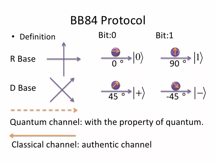 这段俩人职业生涯中的这场魔幻相遇促成了量子信息编码与公钥密码学的结合,时间远早于彼得·肖尔提出自己的shor算法,可见两位思想的超前性。两人随后展开合作,并于1984年在一场IEEE会议上详细发表了原创的安全通信协议——“BB84协议”,具体操作如下图所示: