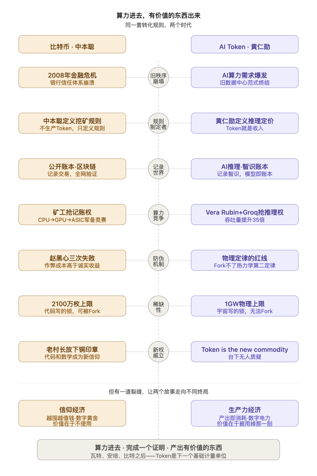 AI 时代的 Token 就是 BTC 2.0。文章通过对比中本聪创造比特币与黄仁勋定义AI算力规则,揭示了新旧秩序交替的宏大逻辑:当中心化信任与旧计算范式崩塌后,基于算力竞争和物理定律的新价值体系——Token经济——已然确立。 ## 1. 旧秩序的崩塌 - **2008年:金融信任的终结**。银行作为中心化信任机构在金融危机中崩塌,中本聪在比特币创世区块刻下对旧体系的宣战书,标志着代码和数学成为新信仰的开始。 - **2026年:旧计算范式的终结**。黄仁勋宣告以字节为单位的旧数据中心范式过时,新的度量衡是Token,同一座1GW数据中心的Token生成速率在两年内提升了350倍,达到7亿。 ## 2. 新规则的制定者 - **中本聪:用代码定义信任规则**。他设计了公开、不可篡改、靠算力竞争维护的分布式账本(区块链),将记账权从中心化机构转移给全球矿工。 - **黄仁勋:用硬件定义Token经济**。他展示了AI Token的五个定价档(从Free到Ultra),并明确指出“Token就是收入”,为算力工厂规划了清晰的商业模式。 ## 3. 账本与推理:记录世界的两种方式 - **比特币记账:村庄的公开账本**。交易通过全网广播,矿工通过“挖矿”(计算哈希难题)竞争记账权,账本更新速度稳定在约十分钟一页。 - **AI推理:智识的即时记录**。每一次用户与AI的交互都是一次“推理记账”,模型消耗电力将输入转化为有价值的Token输出,其本质与挖矿相同:把电力变成有价值的东西。 ## 4. 记账权的竞争:从矿工到推理机 - **矿工:算力即资格**。挖矿硬件经历了从CPU到ASIC的军备竞赛,算力越强,获得比特币记账奖励的概率越大。 - **推理权争夺:专用硬件的胜利**。黄仁勋推出Vera Rubin与Groq LPU组合,将推理吞吐量提升35倍,实现1000 Token/秒的生成速度,标志着AI推理的“ASIC时刻”到来。 ## 5. 防伪机制:代码锁与物理锁 - **比特币的三道防线**。哈希防伪、节点验证和经济惩罚三者结合,使得作弊成本远高于诚实收益,确保了账本安全。 - **AI Token的物理定律**。数据中心的土地、电力和散热存在物理上限,建造1GW数据中心的成本约400亿美元,这种由热力学定律铸造的天花板,比代码更难以打破。 ## 6. 稀缺性的来源 - **比特币:代码铸造的稀缺**。总量2100万枚的上限被写死在代码中,通过约四年一次的减半机制实现,但代码可以被Fork。 - **AI Token:物理铸造的稀缺**。1GW数据中心的物理容量是固定的,稀缺性源于物理定律,迫使企业追求最强计算架构以降低单位Token成本。 ## 7. 新权威的确立 - **中本聪的消失与代码权威**。老村长放下铜印章,矿机成为村庄的新权威,规则由代码自动执行,中本聪在完成设计后彻底隐身。 - **黄仁勋的存在与物理权威**。黄仁勋宣告“Token是新的大宗商品”,并将产品线精确铺在市场的每一层,其权威建立在物理世界的算力工厂之上。 ## 尾声:两种Token的终局 - **Crypto Token是信仰经济**。其需求侧是投机,价值在于不使用,像数字黄金。 - **AI Token是生产力经济**。其需求侧是实际应用(如Claude Code),价值在于被消耗的瞬间,像数字电力,用户不需要相信它,但已经离不开它。