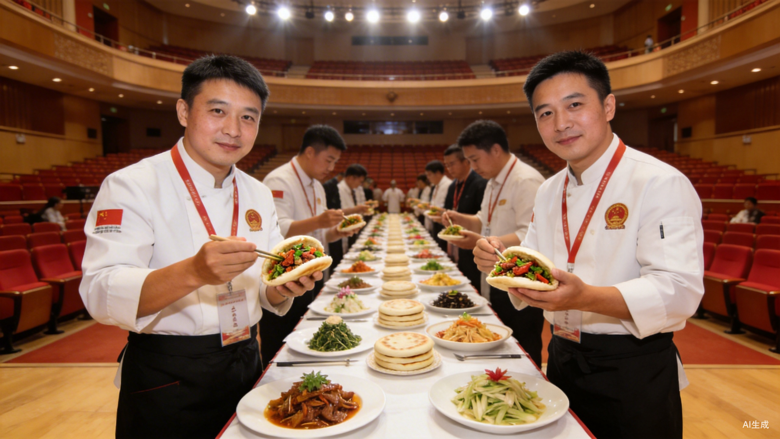 剧院的前厅里既回荡着现场大提琴的琴声,又飘着油泼辣子的香气。土豆丝、海带丝、胡萝卜丝、紫甘蓝、锅巴、花生米……20种凉菜在长桌上整齐排开。选手们跟着领馍员入场,人手一块刚出炉的白吉馍,挑战在1分钟内夹出分量最重的菜夹馍。