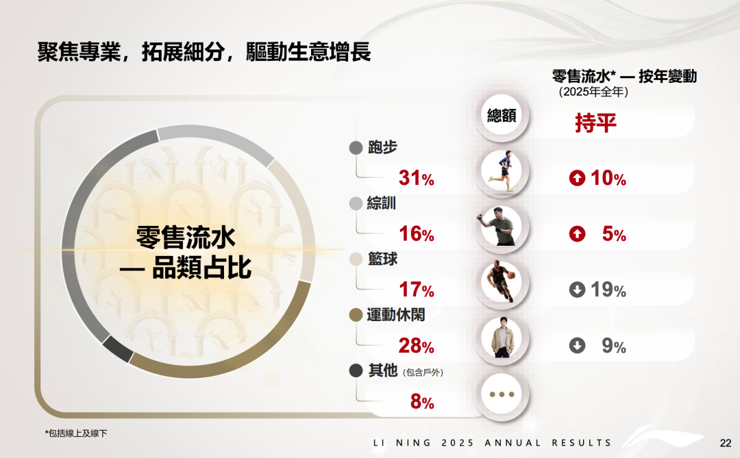 对比之下,原先李宁主要押注的篮球业务,近几年随着CBA等篮球赛事在国内的关注度回落,篮球品类在大众层面的带动作用也有所减弱。2025年,篮球在李宁零售流水中的占比为17%,零售流水同比下滑19%。当原有优势赛道的牵引力开始减弱,寻找新的增长抓手尤为重要,结合行业跑步趋势,跑步市场顺势受到更多重视。