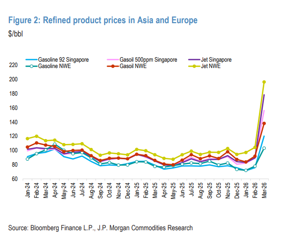 据追风交易台,摩根大通3月19日发布的大宗商品研究报告显示,随着精炼油品供应骤然收紧,亚洲多个经济体已被迫采取紧急节能措施,航空公司削减航班、石化企业宣布不可抗力,能源冲击正从价格层面向实体经济层面快速蔓延。