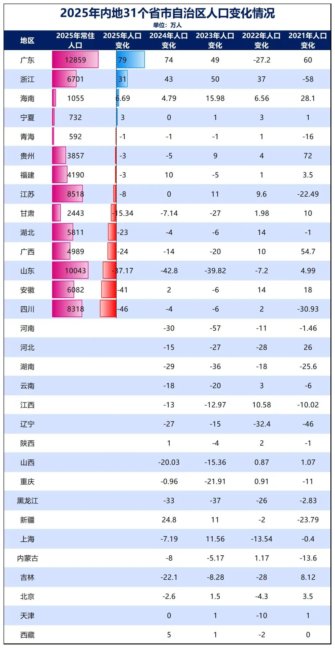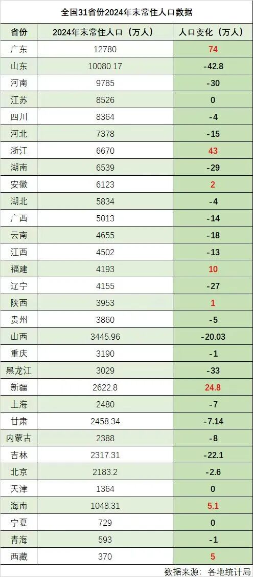 到2025年,常住人口过亿的省份仍有两个,但山东在连续减少后只有10043万人,不排除未来两年内跌出“亿级人口省份”行列。