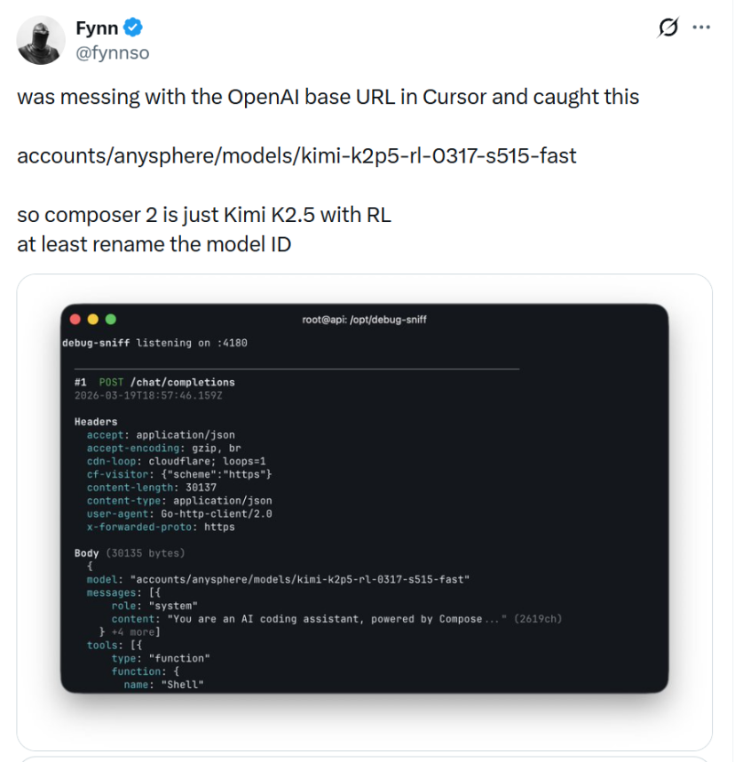 一个叫Fynn的开发者在调试Cursor的OpenAI兼容接口时,看到了API返回的模型标识符:accounts/anysphere/models/kimi-k2p5-rl-0317-s515-fast。