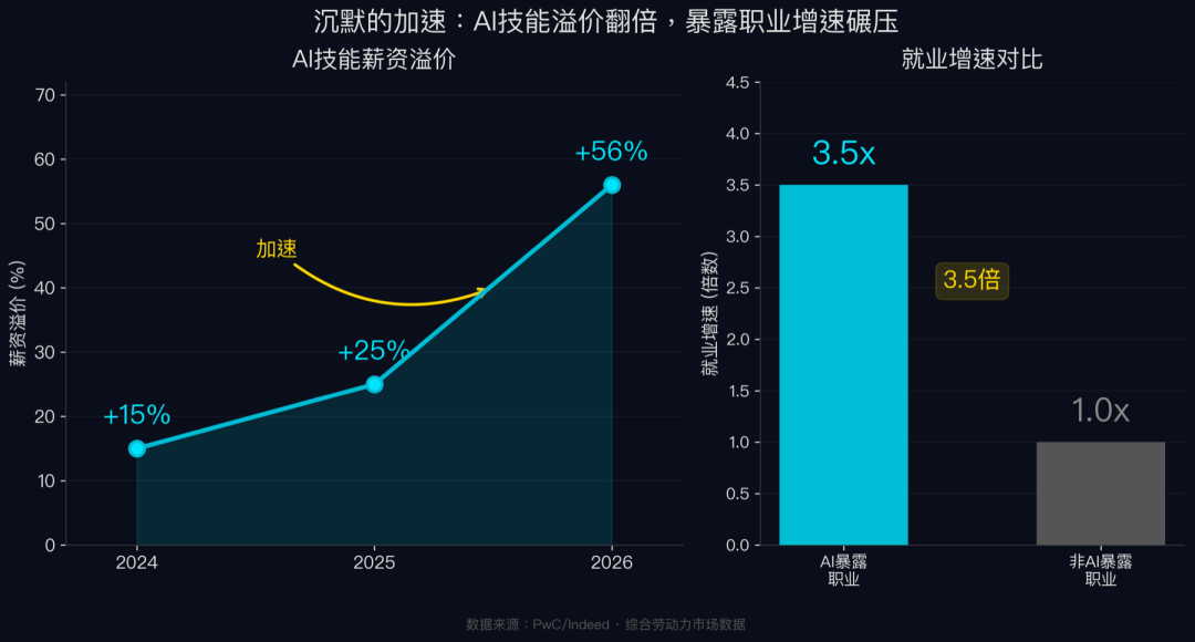 理论能力和实际采用之间的61个百分点,不会永远停在那里。Cognizant(全球最大IT服务公司之一)的跟踪数据显示,职业AI暴露度的年均增速已经从2%加速到9%——4.5倍。PwC(普华永道,全球四大会计事务所之一)的全球AI就业晴雨表显示,AI技能薪资溢价从2024年的25%翻倍到了2025年的56%。AI暴露职业的就业增速,是非暴露职业的3.5倍。