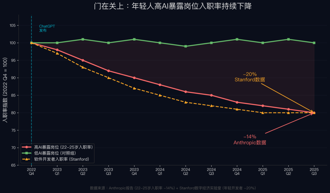 Anthropic报告里藏着一组不太起眼的数字:22到25岁年轻人在高AI暴露岗位的入职率,下降了14%。