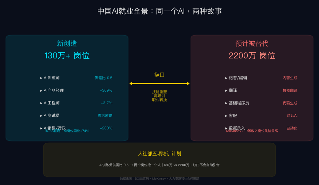 中国就业数据:人社部、BOSS直聘2025年AI人才报告 (2026-01)、Bloomberg (2026-03)、McKinsey全球预测、中国日报