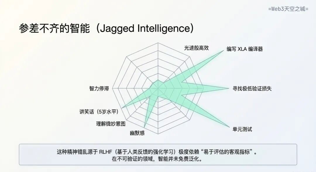 尽管智能体展现了惊人的杠杆效应,但Karpathy提醒人们注意当前AI表现出的“严重参差感”。这种不均衡性在代码生成等可验证领域表现极佳,但在幽默感或意图理解等模糊领域则显得滞后。