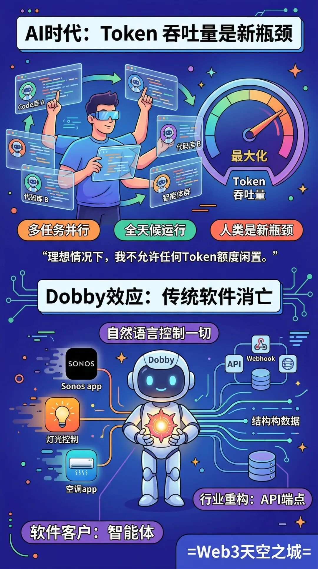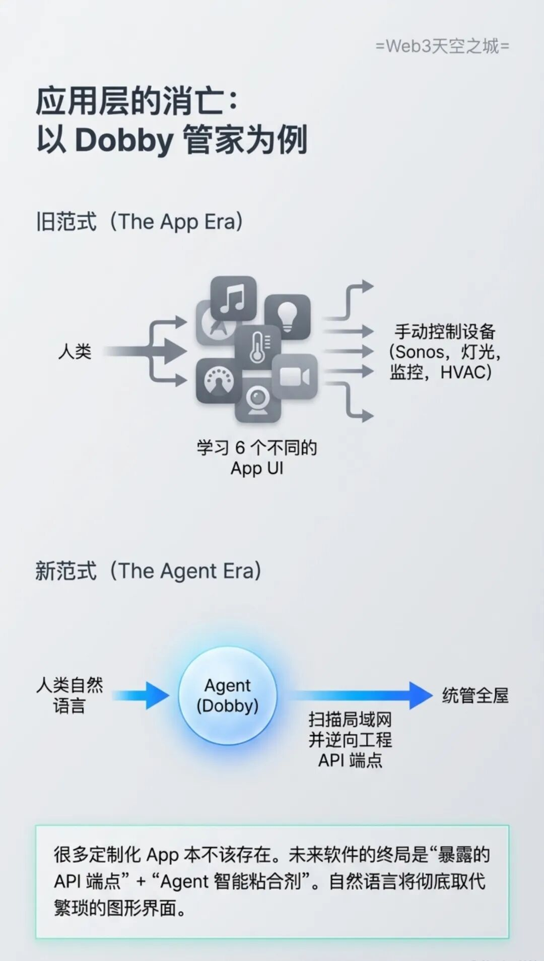 “我过去常使用大约6个完全不同的应用程序。现在我不再需要它们了,Dobby用自然语言控制一切。”这一实践引出了一个深刻的商业预判:未来或许不再需要那么多定制化的UI界面。软件的客户将不再是人类,而是代表人类行事的智能体。这意味着整个行业必须重构,“一切都应该更多地表现为暴露出来的API端点,而智能体正是其中的智能粘合剂。”