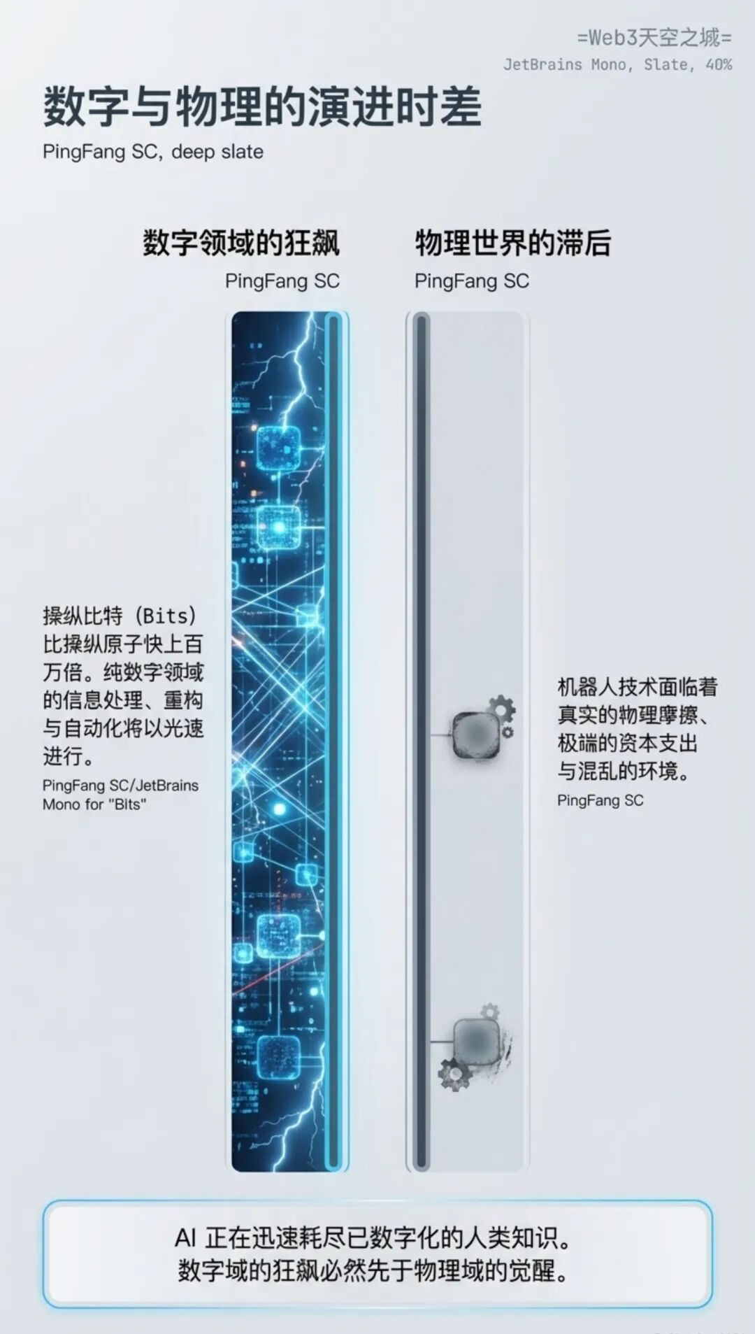 个人感觉它会落后于数字领域的发展进度。在数字领域,将会有大量的束缚被解除。原本效率不高的事物,通过比特处理的便捷性,效率将提升百倍。数字空间将发生巨大的改变。届时物理空间的发展将会滞后。两者之间的接口也非常有趣,如果拥有更多代表人类行事的智能体,相互交流、执行任务,单纯在数字空间内能做的事情终将耗尽。在某个节点,必须回归宇宙并提出问题。必须进行实验,观察宇宙给予的回馈,以此获取知识。