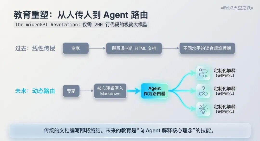 以前如果开发出了microGPT,会很想向人们解释它。比如有一个视频,演示了它是如何一步步执行的。确实尝试制作了那个视频。还尝试制作了一个关于它的小指南。但意识到这其实并没有增加太多的价值。因为它已经足够简单,总共只有200行代码,任何人都可以让他们的agent以各种方式对其进行解释。对于这些agent,不再需要向人类解释了。是在向agent解释。如果能向agent解释清楚,agent就可以作为路由器,根据人类的语言水平,以无限的耐心和与其能力相匹配的方式传达给人类。