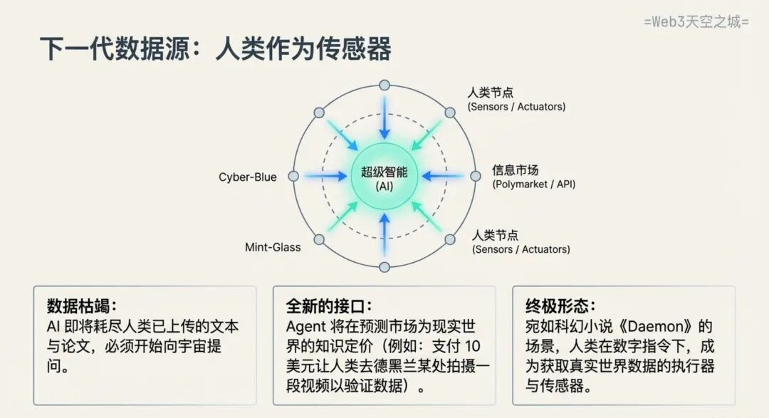 有点惊讶竟然还没有足够的信息市场。比如Polymarket或其他博彩市场,甚至是股票市场等,拥有如此多的自主活动且活动量不断增加。为什么不能实现比如现在的伊朗事件,通过拍摄德黑兰某处的照片或视频并支付10美元来获取信息呢?应该有人能够为此买单。这是一个为人工智能提供数据供给的例子。背后不会有人类在查看这些内容。将由试图预测博彩游戏和股票市场走势的Agent来完成。目前的“基因网络”依然相当新,还没有出现相应的机制。但这正是未来可能会发生的一个例子。有一本很有启发性的书叫Daemon。在Daemon中,人工智能最终几乎操纵了人类,所以人类像是它的执行器,但同时也是它的传感器。