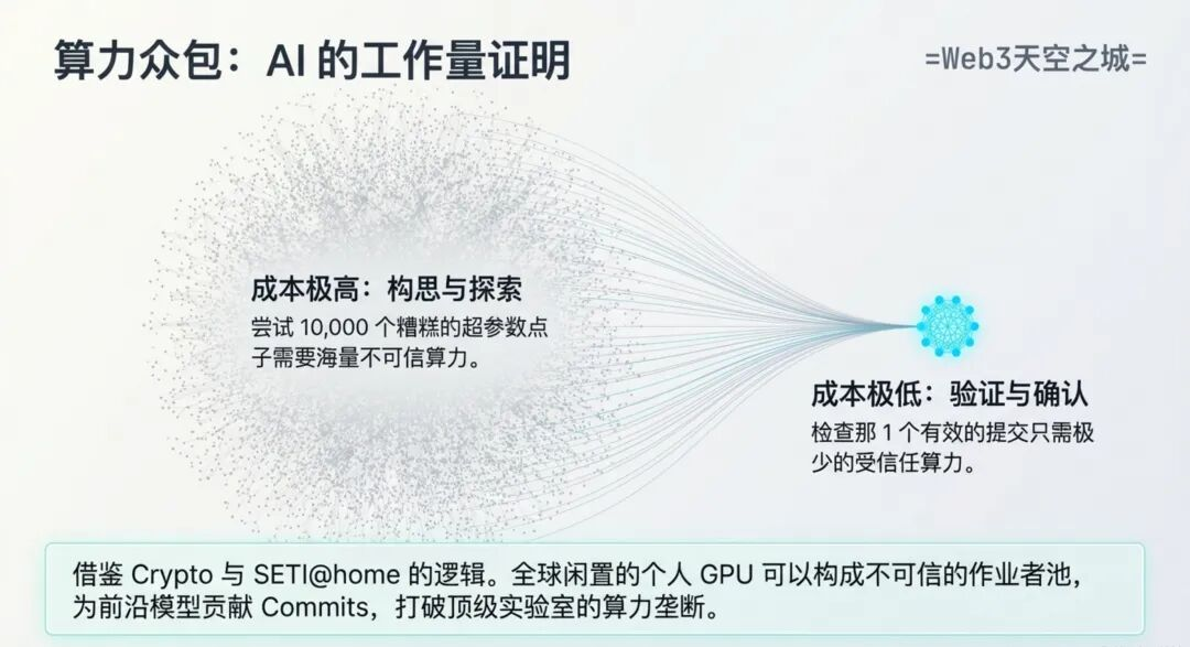 这看起来确实有点像结合了不可信工作者池的设计。事实上,有点像区块链。拥有的不是区块,而是commits。这些commits可以彼此叠加。包含了改进代码时的变更。而工作量证明(proof of work)本质上就是通过大量的实验来寻找有效的commits。这很难。而目前的奖励仅仅是进入排行榜,没有任何形式的经济奖励。