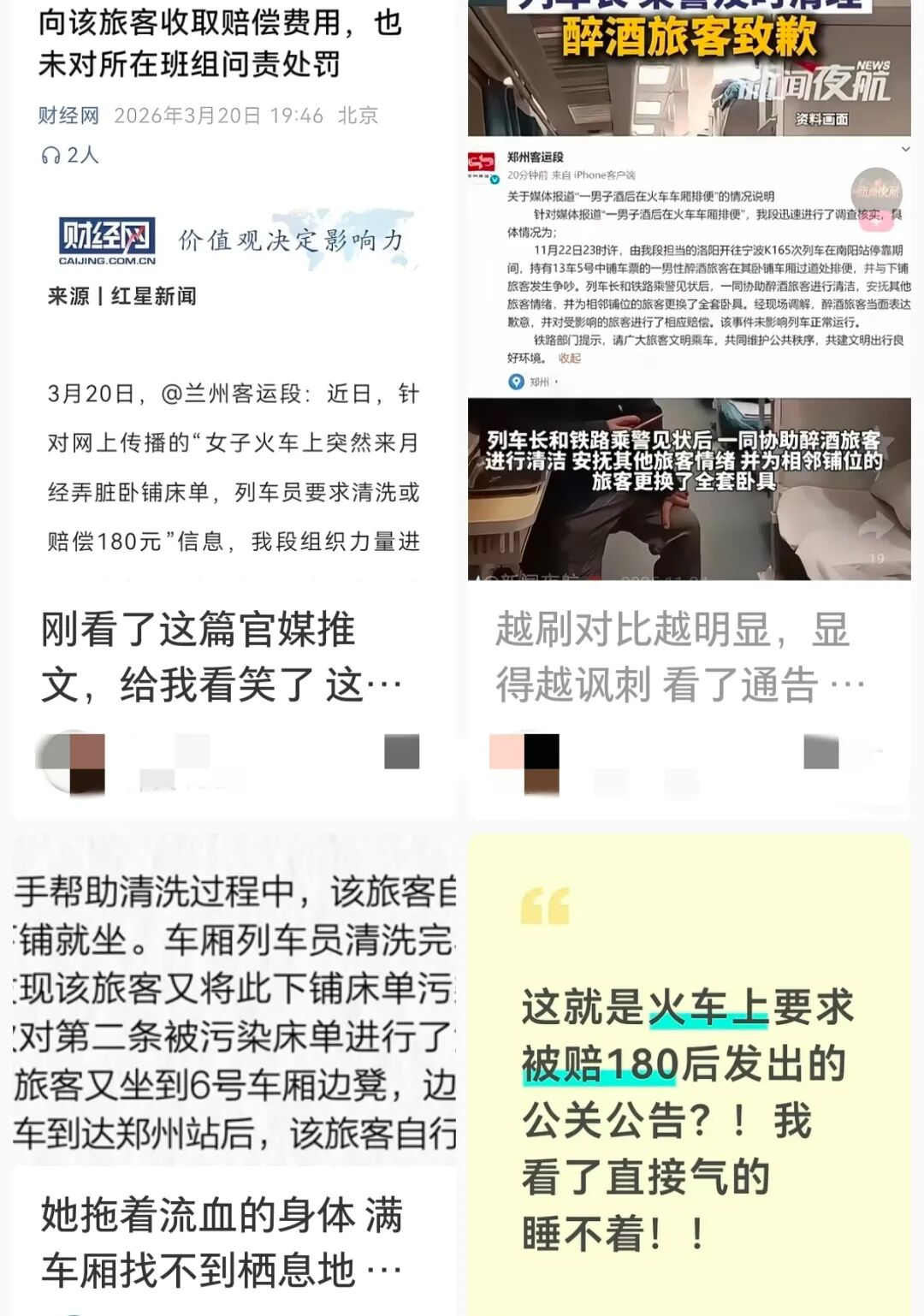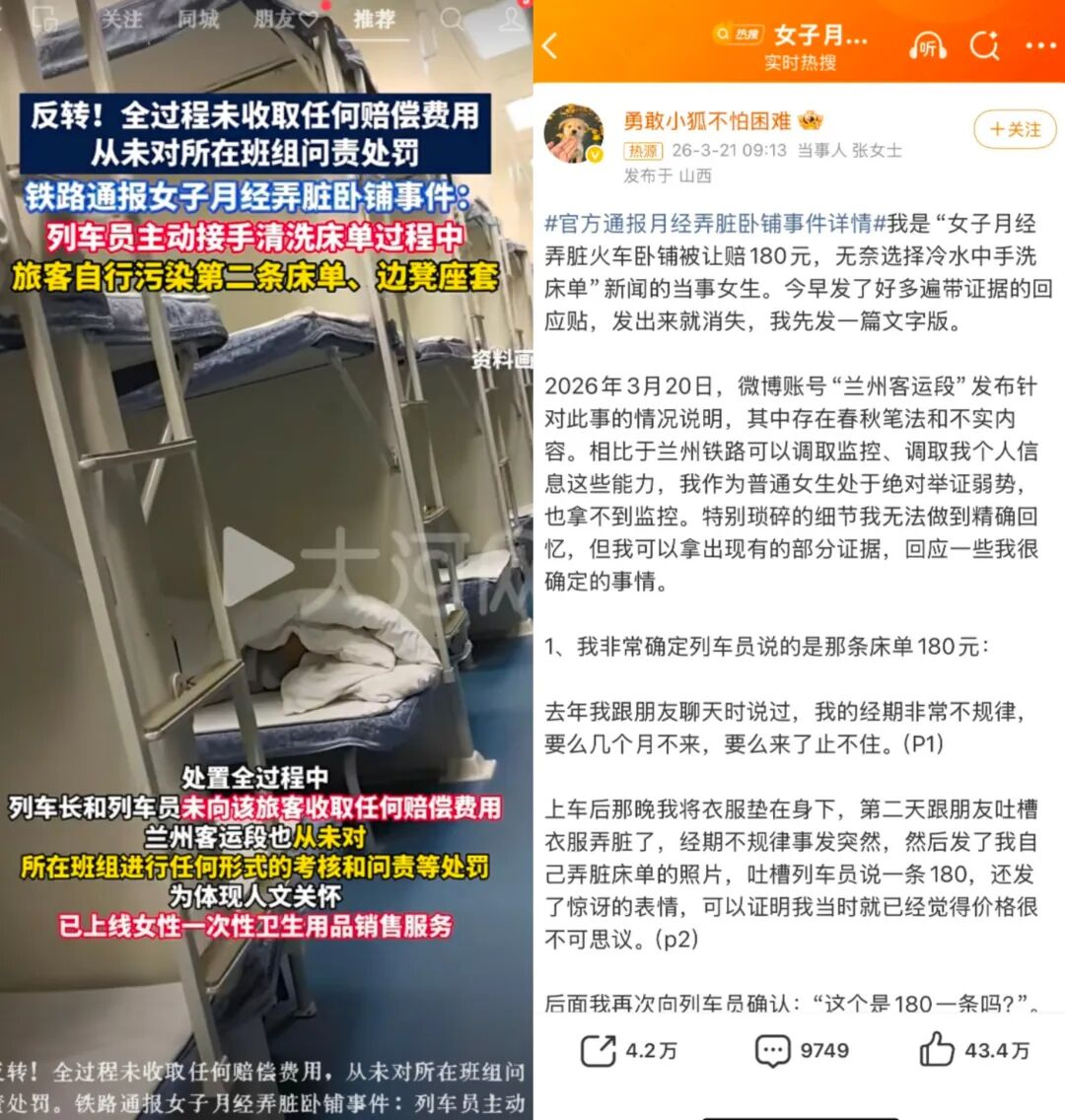 一名女子坐火车卧铺,月经突然来了。车上没有卫生巾售卖,她弄脏了床单。工作人员给出两个选择:自己洗干净,或者赔偿180元。