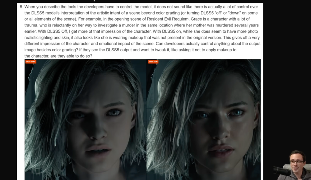 第五轮追问:以《生化危机》的格蕾丝为例,她是一个带着创伤赶赴命案现场的角色,DLSS 5让她看起来像是化了妆准备去约会。开发者能不能告诉DLSS 5「不要给她加妆」?开发者到底拥有多大的控制权限?
