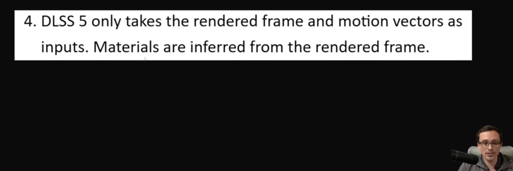 根据Owen从英伟达布道师那里获得的答案,DLSS 5模型从最终的2D渲染帧里「推断(infer)」材质属性。