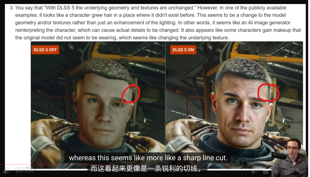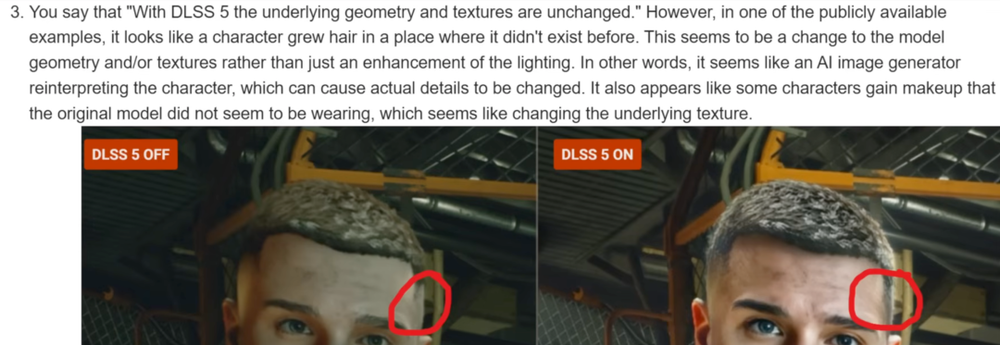 以及,未开启DLSS 5的原场景中,人物后方的光源照亮了他的右侧耳后——这个光线效果在DLSS 5生成的版本中也消失了。整个人物被均匀打亮,像是开了直播补光灯,破坏了开发者/美术原本的场景设计。
