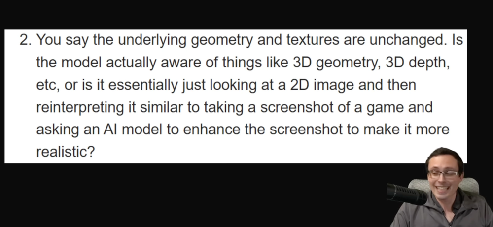 第二轮追问:英伟达此前说的「底层几何和材质不变」,那么DLSS 5模型是否真的理解3D几何、深度等细节,或者只是分析2D帧?