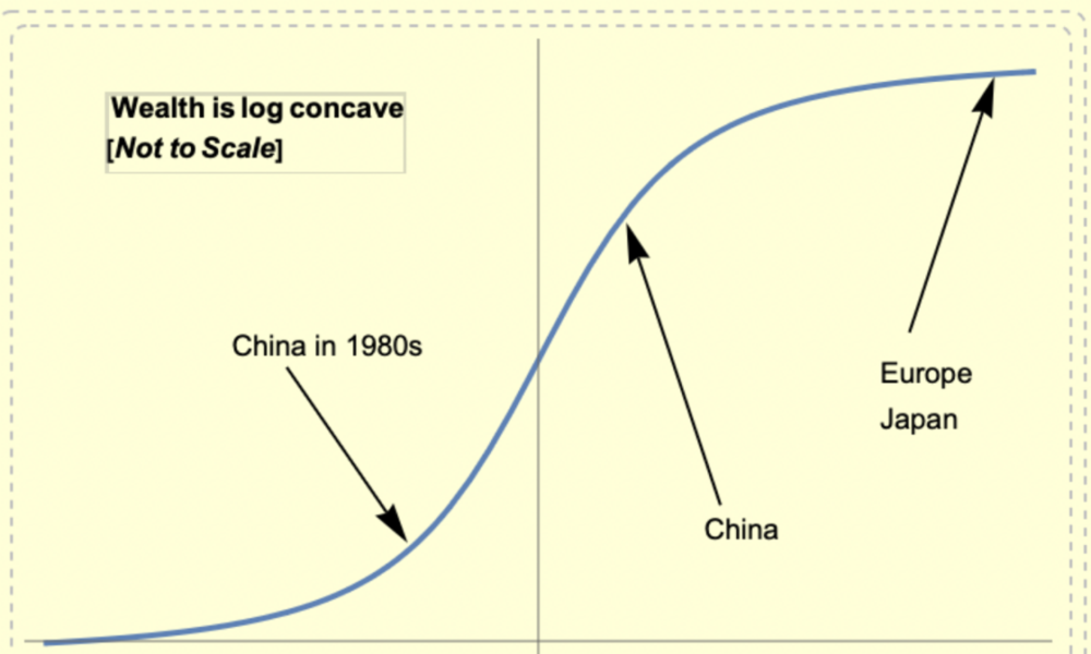 第三个要点是S曲线,我在《反脆弱》里讨论过。在生物学和经济学中,增长往往先是凸性的高速扩张,然后逐渐放缓进入饱和阶段——增长虽然可能没有上限,但仍然低于对数型的无限增长。