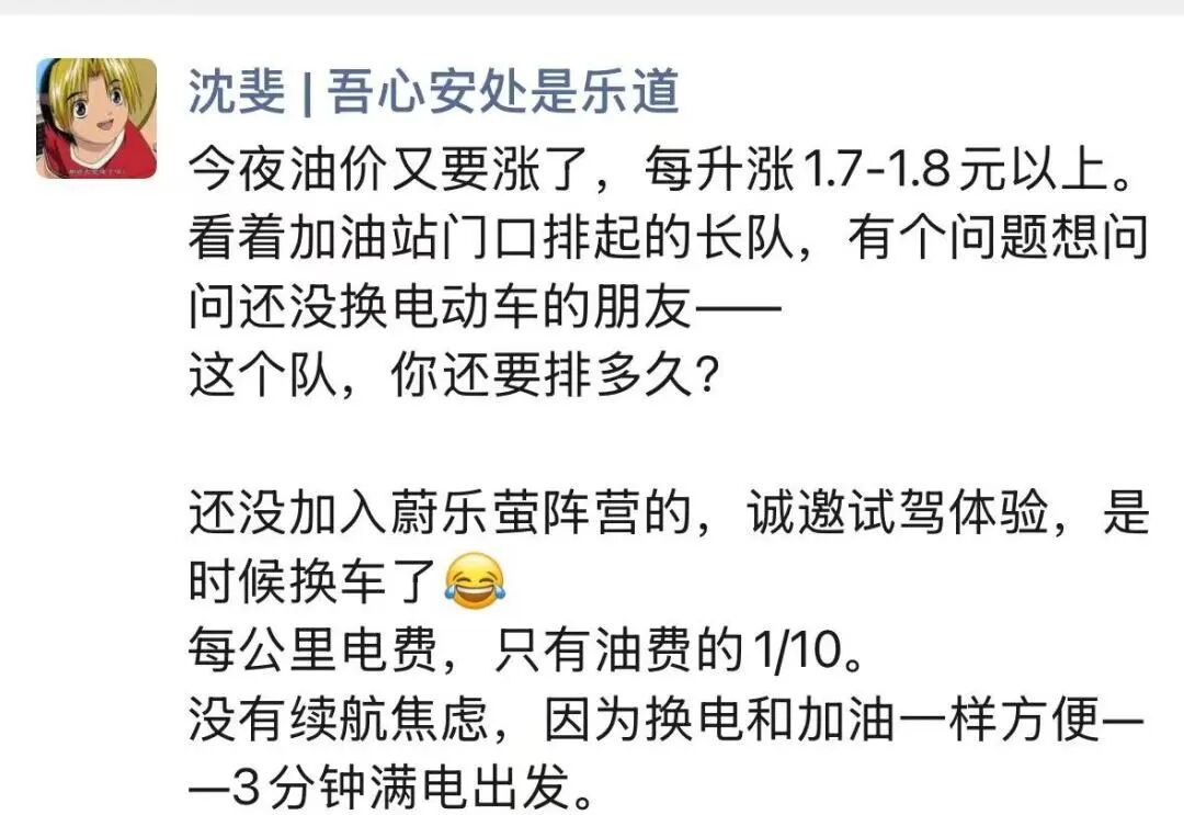 乐道汽车总裁沈斐在油价飙升之时也“幸灾乐祸”地发了个朋友圈,“看着加油站门口排起的长队,有个问题想问:问还没换电动车的朋友一这个队,你还要排多久?”